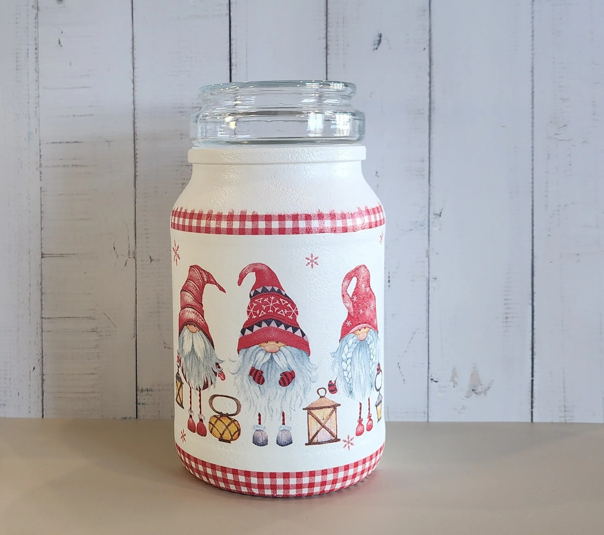 Our Jars are collected locally, cleaned thoroughly, then painted and decorated using a decoupage technique. The item is then coated with sealant so it can be cleaned with a damp cloth when required.