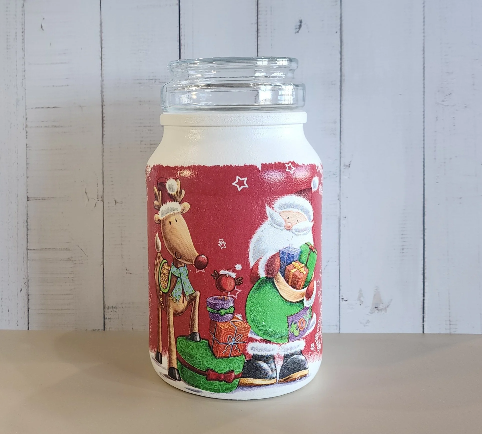 Our Jars are collected locally, cleaned thoroughly, then painted and decorated using a decoupage technique. The item is then coated with sealant so it can be cleaned with a damp cloth when required.